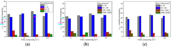 Taking the parameter distribution of the pore diameter as an example, the pore sizes of the four fiber dosages were relatively large at between 0~5 μm and 5~10 μm, accounting for about 90% of the total pores. When BF was added, the proportion of large volume pores was significantly reduced. When the fiber dosage was 0 kg/m3, 1.5 kg/m3, 3 kg/m3, and 4.5 kg/m3, the proportion of macropores (with diameter of 10~40 μm) was 15.71%, 9.76%, 4.32%, and 11.56%, respectively. When the fiber dosage was 3 kg/m3, the proportion of macropores was the least and there were no pores with a diameter between 20 and 40 μm, and the maximum pore diameters of the four groups of specimens were 1.85 mm, 1.50 mm, 0.94 mm, and 1.34 mm, respectively, indicating that this is the best dosage of fiber.