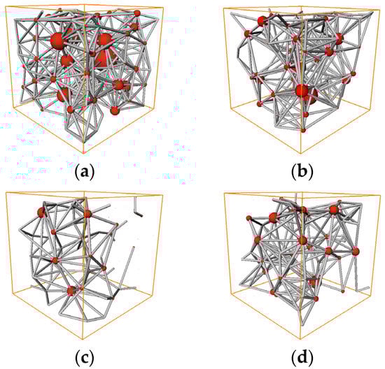 Ball-and-stick network model of each specimen. (a) 0 kg/m3, (b) 1.5 kg/m3, (c) 3 kg/m3, and (d) 4.5 kg/m3.