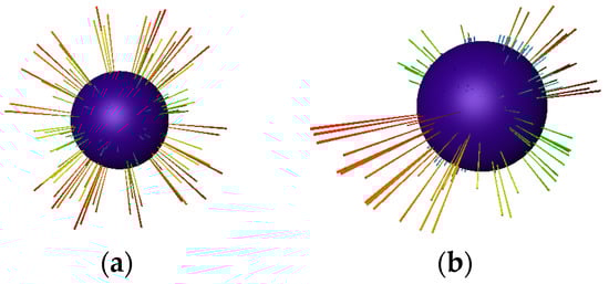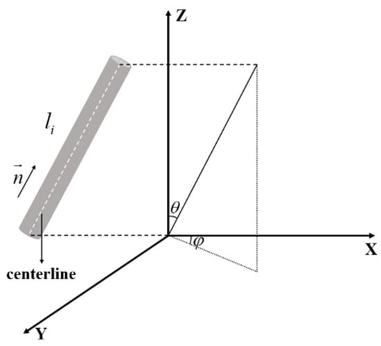 The fiber orientation is represented by the orientation angle. As shown in Figure 16, the Cartesian three-dimensional coordinate system XYZ was established, and the general definition of fiber orientation angle in three-dimensional space was given [,]. Ideally, assuming that there is no bending of the fiber, the fiber is regarded as a straight rod, and the fiber section is a regular circle. The included angle between the fiber centerline (central axis) and the Z-axis is defined as the orientation angle , and the included angle between the projection of the fiber centerline (central axis) in the XOY plane and the X-axis is defined as the orientation angle . According to the definition, the orientation of any fiber in the space can be determined by , where and is a pair of orientation angles of the fiber [,,].