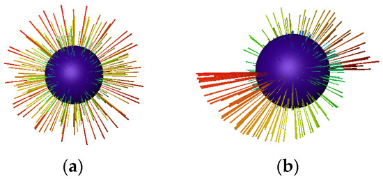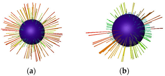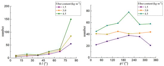In the fiber distribution model in Figure 15, it can be observed that most of the fibers are mainly distributed inside the specimen in a horizontal inclined state, and the number of fibers distributed vertically is small. Using the software, the θ and φ spherical coordinates’ distribution map of the fiber in the model can be obtained, which is shown in Figure 17, Figure 18 and Figure 19.