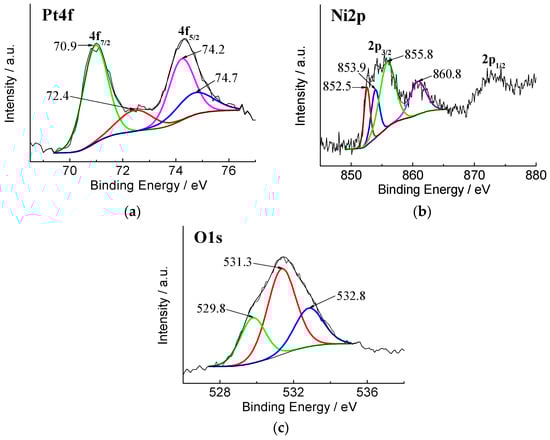 High-resolution XPS spectra of PtNi/Nifoam: (a) Pt 4f; (b) Ni 2p; (c) O1s.