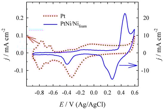 The presence of Pt on the surface of the Ni/Nifoam electrode was confirmed by the cathodic peak located at ca. −0.4 V in the alkaline 1 M NaOH solution. The electrochemically active surface areas (ECSAs) of the prepared Pt and PtNi/Nifoam catalysts were determined from the CVs recorded in a deaerated 0.5 M H2SO4 solution at a scan rate of 50 mV s−1 (Figure S1, Supplementary Material) by calculating the charge associated with hydrogen adsorption at 210 μC cm−2 [61]. The ECSA for the PtNi/Nifoam electrode is 71 cm2, and that for the bare Pt substrate is 1.5 cm2. The above results reveal that the PtNi/Nifoam electrode has significantly higher current values and a larger surface area than the bare Pt substrate, and it outperforms the Pt electrode ca. 47-fold.