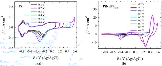 The electrochemical performance of the Pt and PtNi/Nifoam catalysts was evaluated by progressively increasing the anodic reverse potential limit (Era). A series of CVs for Pt and PtNi/Nifoam catalysts were recorded in a 1 M NaOH solution at different Era values at a scan rate of 50 mV s−1 (Figure 3). The CV curves of the bare Pt electrodes (Figure 3a) are consistent with those typically found for bare Pt electrodes in an alkaline solution. They are characterized by the following three potential regions: (a) a hydrogen adsorption/desorption region (−0.9 < E < −0.6 V), (b) a double layer region (−0.6 < E < −0.45 V), and (c) a hydroxide–oxide formation region (−0.45 < E < +0.6 V) [62,63,64]. The applied potential region can generate two types of oxygen-containing species, namely, PtOH and PtO [65]. This common potential domain, up to ca. −0.10 V, is attributed to OH− ion electroabsorption with charge transfer and the formation of surface hydroxides (OH− → OHad + e− in alkaline solutions) [63,66,67]. This potential domain is associated with reversible and weak OHad adsorption before the oxide layer formation. A more positive E domain represents the only somewhat reversible formation of strongly bound OHad species and high-valent oxides. The most positive potential region up to +0.6 V is attributed to stoichiometrically different Pt-OH species that transform into Pt-O−, Pt=O, or Pt2=O, depending on the surface coverage of strongly adsorbed OHad.