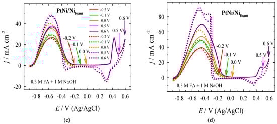 The influence of the first applied potential scan cycles recorded for the PtNi/Nifoam catalyst for different Era values in alkaline FA was investigated. For the sake of simplicity, only the positive-going potential CVs with two different Eras (−0.2 and +0.6 V) for the PtNi/Nifoam catalyst in a 1 M NaOH solution, containing different FA concentrations of 0.1, 0.3, and 0.5 M, are presented in Figure 5. Successive cycling in the potential region with an Era of −0.2 V resulted in an apparent jpf decrease at all FA concentrations applied to the PtNi/Nifoam catalyst. Meanwhile, when the Era was decreased to −0.6 V to include the potential window for the oxidation of Ni2+ to Ni3+, the jpf increased (unlike when Era = −0.2 V) and increased further with increasing FA concentration, indicating an improvement in FO. Changing the Era from −0.2 to +0.6 V resulted in increases of ca. 1.3, 1.4, and even 1.8 times for the Ipf values, for 0.1, 0.3, and 0.5 M FA containing alkaline solutions, respectively, on the PtNi/Nifoam catalyst. An increase in FA concentration from 0.1 to 0.5 M led to ca. 4.4–6.1-fold increased jpf values when the upper potential limit was −0.2 V or +0.6 V. Furthermore, a decrease in jpb values can be observed on the negative-going potential scans presented in Figure S3 (Supplementary Material), regardless of the Era value applied. Notably, when Era = −0.6 V, the forward and backward-going current density peak values become closer to each other, indicating better catalyst tolerance to the accumulation of carbonaceous species.