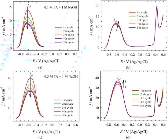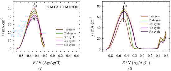 An increase in the number of applied scan cycles leads to a change in the slight shape transformation of the stabilized CVs, resulting in a broader formate oxidation current density peak on the bare Pt electrode (Figure 4a,b). Current density peaks for FO on forward (anodic voltammetric) and backward scans are denoted (jpf) and (jpb), respectively. It is impossible to propose an unambiguous treatment of the origin of the oxidation peak obtained in the case of stabilized CVs on the bare Pt electrode, as the overlapping of the peaks is not excluded, and the merging of direct and indirect FO pathways is presumable.