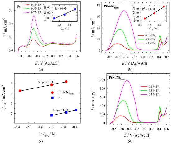 The electrocatalytic activity of the investigated catalysts toward FO on FA concentrations is shown in Figure 6. The insets in Figure 6a,b represent the linear relationship between jpeak and CFA, indicating the irreversible electrochemical process kinetics on both Pt and PtNi/Nifoam catalysts [73]. Moreover, the peak potential slightly shifted to the positive potential values with increasing FA concentration (Figure 6a,b). The reaction order of FO oxidation was determined by the slopes of lnjpeak vs. lnCFA (Figure 6c) using Equation (2) [73].