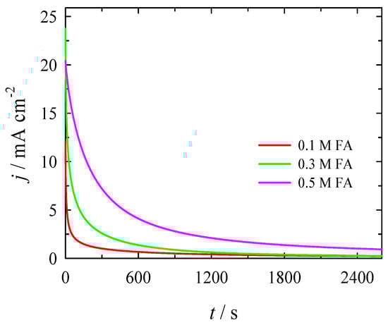 CA data for the PtNi/Nifoam catalyst were recorded in a 1 M NaOH solution containing 0.1, 0.3 and 0.5 M FA, at a constant potential value E = −0.6 V for 2600 s.