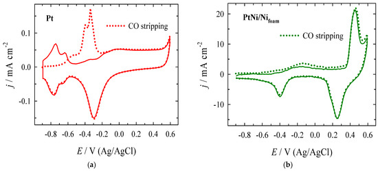 CVs for the oxidative CO stripping from the Pt (a) and PtNi/Nifoam (b) catalysts surface in 1 M NaOH at a scan rate of 50 mV s−1. CO was adsorbed at −0.9 V from 1 M NaOH for 15 min; a potential sweep was carried out in an N2-saturated solution.
