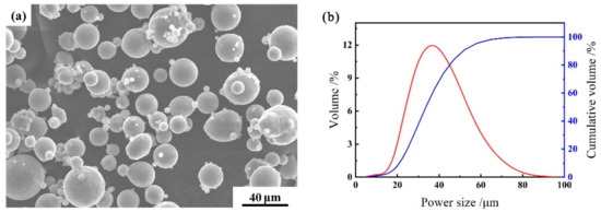 The morphology of AlSi10Mg (a) and the particle size distribution of AlSi10Mg powder (b).