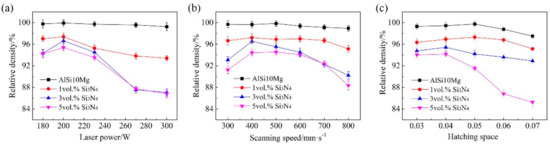 Figure 3 shows the relative density of nano-Si3N4/AlSi10Mg composites as the function of laser power (at laser scanning speed 500 mm/s and hatching space 0.05 mm), laser scanning speed (at laser power 200 W and hatching space 0.05 mm), and hatching space (at laser power 200 W and laser scanning speed 500 mm/s). It can be seen that as the content of Si3N4 nanoparticles increases, the relative density of the samples decreases and the optimum process parameter window shrinks greatly. Due to the strong agglomeration tendency caused by their high specific surface area, the nanoparticles may lead to an increase in the composite porosity. With the increase in the nanoparticle content, the fluidity of the powders becomes worse, which leads to more gas trapping between nanoparticles.