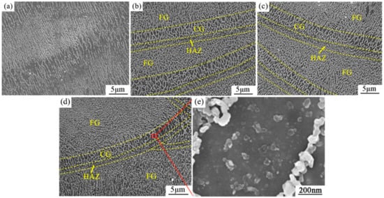 SEM images of nano-Si3N4/AlSi10Mg composites with different Si3N4 contents: (a) Pure AlSi10Mg, (b) 1 vol.% Si3N4, (c) 3 vol.% Si3N4, (d) 5 vol.% Si3N4, and (e) microstructure inside a single cell.