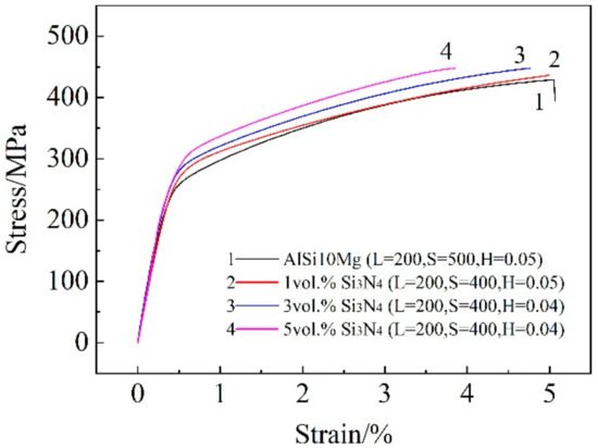 Tensile stress–strain curves of pure AlSi10Mg and nano-Si3N4/AlSi10Mg composites (L represents the laser power/W, S is the scanning speed/(mm·s−1), and H is the hatching space/mm).