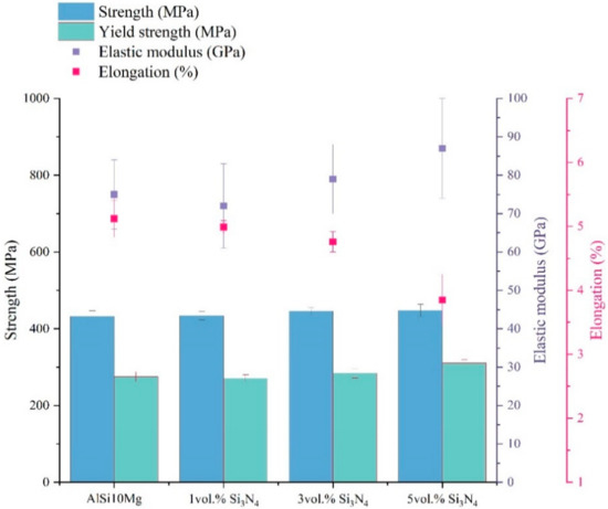 As for the composite’s strengthening mechanism, the second phase strengthening and the fine grain strengthening are included. On the one hand, the hard/brittle Si3N4 phase uniformly dispersed in the matrix and blocked dislocation movement during deformation, increasing strength and reducing elongation. That is to say, the second-phase strengthening was the main strengthening factor. Moreover, with the increase in the Si3N4 content, the more obvious the increase in strength, the more obvious the decrease in elongation. On the other hand, as shown in Figure 4, the grain size decreased to a certain extent after the addition of Si3N4 and fine grain strengthening could also improve the strength of the material. In addition, the porosities of different alloys were tested (Table 3), which indicated that the high Si3N4 content corresponds to the high porosity. The defects caused the alloy mechanical properties to deteriorate. Considering all the above factors, the strength of the alloy did not increase significantly. Therefore, the nano-Si3N4/AlSi10Mg composite with a 5 vol.% Si3N4 content shows the highest tensile strength and yield strength.