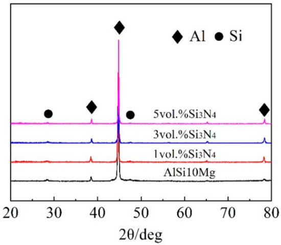 XRD diffraction patterns of AlSi10Mg and nano-Si3N4/AlSi10Mg composites.