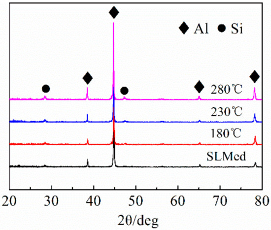 The 3 vol.% nano-Si3N4/AlSi10Mg composite was used for heat treatment tests because it had a high relative density (>97%) and better mechanical properties compared with the other nano-Si3N4/AlSi10Mg composites. Figure 9 demonstrates the XRD patterns of 3 vol.% nano-Si3N4/AlSi10Mg composite samples upon heat treatment under different annealing temperatures. The microstructure of a 3 vol.% nano-Si3N4/AlSi10Mg composite after annealing is shown in Figure 10. Annealing at 180 or 230 °C does not change the microstructure noticeably, while annealing at 280 °C seriously decomposes the eutectic structure and spheroidizes the Si phase because of the significant diffusion of the Si phase. When the annealing temperature is low, the diffusion ability of Si is not strong enough to change the eutectic structure. In fact, the meshed eutectic structure distributed along the cell boundary is not uniform and the eutectic Si phase at these locations is more likely to diffuse at a higher annealing temperature, resulting in the decomposition of the eutectic structure. In addition, Si in the solid solution begins to precipitate during annealing, contributing to the Si phase aggregation and granulation.