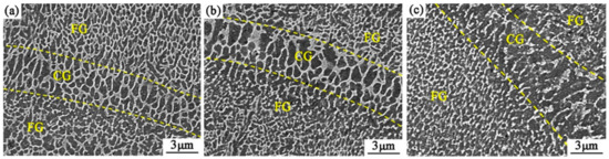 As shown in Figure 4, the microstructure of LPBFed nano-Si3N4/AlSi10Mg composites is mainly divided into three regions: (1) the inner part of the molten pool, which is a fine-cell-structure area with an average cell size of about 1 μm, (2) the boundary of the molten pool, which is a coarse-cell zone, and (3) the heat-affected zone. With the increase in the Si3N4 content, the cell structure becomes smaller. At the same time, the widths of its coarse-cell zone and heat-affected zone also decrease. Figure 4e shows that complete, undecomposed, Si3N4 particles still exist in the composite sample. From a theoretical point of view, the addition of Si3N4 particles affects the energy fluctuation and heat transfer in the molten pool and it also changes the heat transfer in the solidified region to a certain extent. Thus, it reduces the widths of the coarse-cell zone and the heat-affected zone. Furthermore, as Si3N4 particles are dispersed in the molten pool, the solid–liquid interface encounters and engulfs them during solidification at the boundary of the molten pool (see Figure 4e). Si3N4 particles hinder the movement of solid–liquid interface and eventually refine the cell structure. With the increase in the Si3N4 content, the distance between particles further decreases and the influence of refinement also increases.