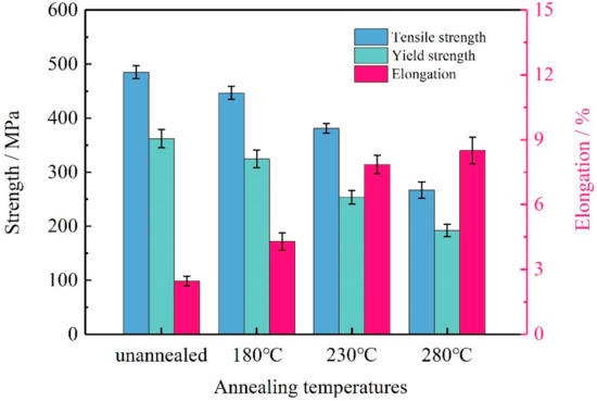 Figure 11 shows the tensile test results of an LPBFed 3 vol.% nano-Si3N4/AlSi10Mg composite at different annealing temperatures. To ensure the reliability of the data, twelve 3 vol.% Si3N4/AlSi10Mg samples were divided into four groups. One group was taken as the control group, and the rest were heat-treated at different temperatures. As the relevant changes in the mechanical properties of the sample could be clearly seen from the original experimental data, Figure 11 was drawn to show these changes: with the increase in the annealing temperature, the strength of the samples decreases while the elongation increases. The tensile fractograph is shown in Figure 12. We can see that, as the annealing temperature increases, the size and depth of the dimple increase, indicating the ductility of the composite increases. At the same time, the microhardness after annealing decreases slightly. The microhardness values of the composite after annealing at 180, 230, and 280 °C are 130 ± 1 HV, 113 ± 2 HV, and 108 ± 2 HV, respectively.