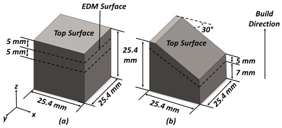 Figure 1 shows the two EBM specimens that were printed for this study. While the aforementioned process parameters were maintained across the two specimens, their geometry was changed to produce one cube featuring a horizontal top surface and another quadrilateral with its top surface aligned at with respect to the horizontal. Following the build, a Hansvedt model DS2 (Hansvedt EDM, Rantoul, IL, USA) wire electric discharge machine (EDM) was used to cut the printed specimens into various sections along the dashed lines shown in Figure 1. One of the objectives of this study was to determine the effect of the as-received surface roughness, which results from additive manufacturing, on the final roughness and residual stress after bead-blasting. Prior studies have reported that inclined surfaces resulting from additive manufacturing have higher roughness compared to the surfaces that are parallel or perpendicular to the build direction [35,36,37,38]. Further, these roughness textures have been shown to assume the greatest values when their parent surfaces have inclinations in the range of 5°–45° [36]. This observation leads to the choice of a surface for delineating the mechanics of bead-blasting in our study.
