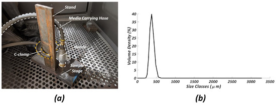 (a) The bead-blasting stage with the nozzle clamped on; (b) Bead size distribution.