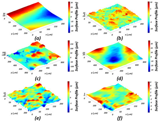 White light profilometry was used to measure roughness textures before and after bead-blasting of the surface resulting from AM. As-received surfaces aligned at and with respect to the horizontal were studied. These correspond to the top surfaces shown in Figure 1a,b, whose white light characterizations before/after bead-blasting are shown in Figure 3a,b, and Figure 3c,d, respectively. In addition, an electric discharge machined surface obtained from the first sample, i.e., Figure 1a, was also studied, whose white light characterization before/after bead-blasting is shown in Figure 3e,f, respectively. Surface roughness was measured on the overall surface, i.e., no cut-off wavelength was used. However, due to the high roughness in the surface, there were ghost errors present in the profilometry. They were filtered out using a cut-off wavelength of .