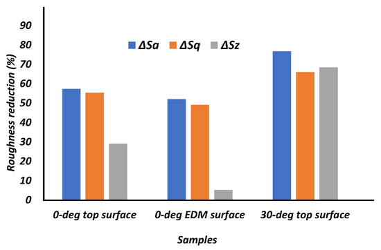 The surfaces exhibited a decrease in roughness values with respect to all three roughness parameters. These changes are reported in Table 1 using parameters , and , which correspond to the arithmetic mean height, root mean square height and maximum height, respectively. Percentage reductions in these parameters are () = (), (), (), for as-received, EDM, and as-received surfaces, respectively. The results are shown in Figure 4.