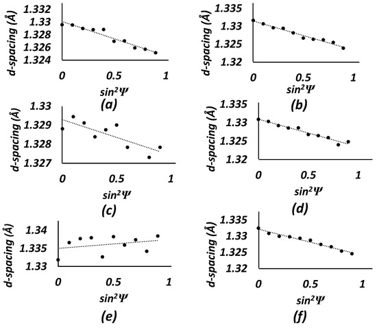Here, and are functions of material constants, viz. Poisson’s ratio and Young’s modulus GPa [47]. The variable refers to the normal elastic residual strain that was measured from the shift of peak using the equation . Here, refers to spacing of planes in the original wrought state and d refers to spacing of the same plane after AM (as-received/EDM/shot-peened) state. The value of at room temperature ( °C) was used, i.e., [48]. This formulation requires measuring elastic normal strains at various values that can be then fit as linear functions of using Equation (1), whose slope can then provide the residual stress . Ten measurements were taken per specimen, and these plots are shown in Figure 5.