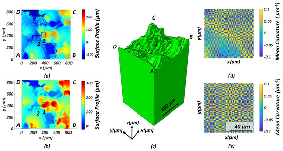 Here, , and are the first and second fundamental coefficients of a surface, respectively. If a surface is parameterized as , and , , then , , . Further, , and , where is a vector, normal to the surface at location . It is realized that the mean surface curvature values can depend on the area of the zone selected for their characterization. This complication was resolved by characterizing the parameter H with respect to increasingly larger areas around the points of indentation. From this variation, the smallest converging values of the mean curvature were selected to characterize the incident surface zones. Figure 6a shows the original unfiltered 30-deg top-surface profile. Complications that may arise from stochastic noise originating from the profilometer were eliminated by applying Gaussian low-pass filters to the surface profiles in the frequency space. This low-pass filter selectively subdued very high frequencies in the surface profile (see Figure 6b) while preserving roughness texture features relevant to the larger length scales relevant to our numerical indentation experiments. Figure 6c shows the generation of this 30 deg top-surface in the FEA model. The numerical indentation experiments were performed on locations 1 and 2, which are demarcated in Figure 6a–c. These locations were characterized with respect to their mean surface curvature as , and , respectively. The mean curvature fields of these convex and concave zones are shown in Figure 6d,e, respectively, which correspond to an area of 80 pixels × 80 pixels or ∼4265 m. Finally, the mean surface curvature of the perfectly flat control surface was m.