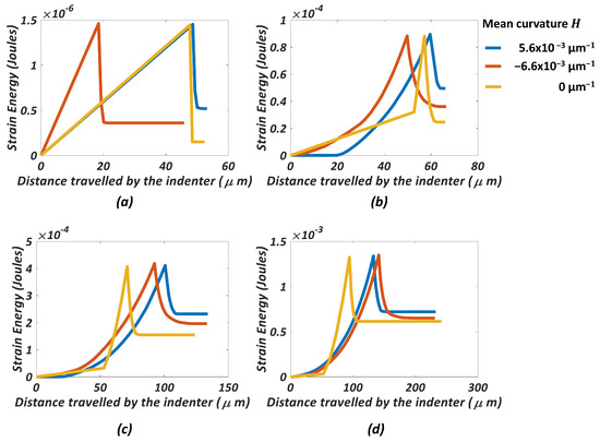 Here, N is the total number of elements, is the volume of an element i, is the Cauchy stress tensor, and is the strain tensor of element i. Implementation of this concept is shown in Figure 7a–d, corresponding to preset energy values of J, J, J, and J, respectively. These plots exhibit unique characteristics that result from the nature of the engagement of the incident shot with the substrate. The maximum indentation depths and rate of energy expenditure were extracted from these curves and are summarized in Figure 8a,b, respectively.