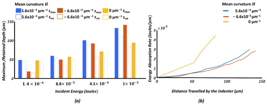 (a) Maximum depthobserved in energy-controlled numerical indentation experiment and (b) rate of energy absorption.