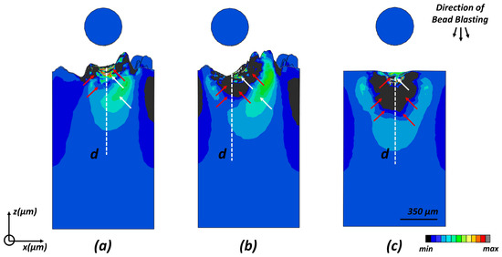 The discrepancies in the mechanical response of surface texture features during bead-blasting (see discussion in Section 4.2) affect the associated residual stress fields. To delineate these effects, residual stress fields resulting from numerically simulated indentation experiments were analyzed. These are shown in Figure 9 for the largest incident energy level— Joules—studied in this research. For easy comparison of these stress fields, the color bar was limited between and MPa. This range comprised about of the total material volume in all cases. Nonetheless, the real (minima, maxima) values are specified in Figure 9 and were for Figure 9a–c, respectively.