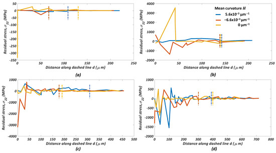 Residual stress depth profile: (a) energy level E1 ∼ Joules; (b) energy level E2 ∼ Joules; (c) energy level E3 ∼ Joules; (d) energy level E4 ∼ Joules. The dashed lines show the distance from the surface after which the stress profile becomes stable.