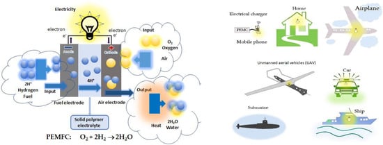 15]. The operation of PEMFC takes place at low temperature (70~90 °C), and the fuel is hydrogen, with a power generation efficiency of about 30–40% [