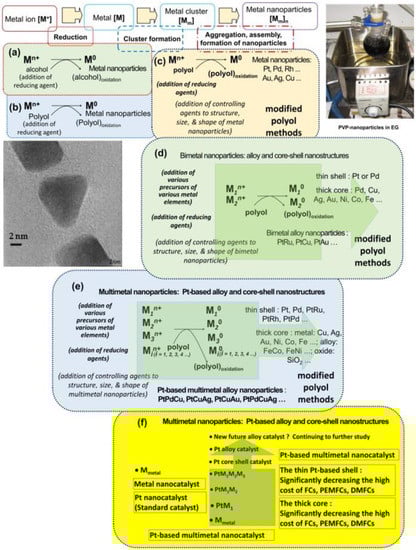93]. Their very high costs of Pt catalysts would be greatly decreased in the technological convergence, nanomaterials (metal, alloy, and oxide), and other components derived from the modified polyol processes. The scientific exlanation of nucleation, growth, and formation of as-prepared nanoparticles from the precursors can be intensively understood [