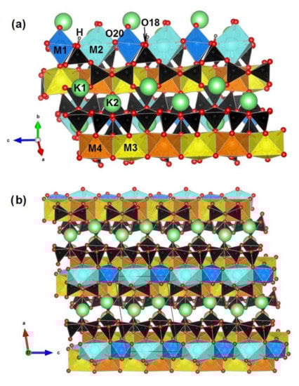 Crystal structure of the studied tinaksite projected down to {110} (a) and {010} (b). Si- tetrahedra are black; Ti-octahedra (M1) and Na-polyhedra (M2) are blue and cyan, respectively; M3 and M4 Ca-octahedra are yellow and orange, respectively. In the tokkoite crystal structure, all the M positions are occupied by Ca ions. K atoms are light green, O and H atoms are drawn in red and grey, respectively. The figure was prepared in the program VESTA (version 4.3.0) [20] using single-crystal data obtained in [21].