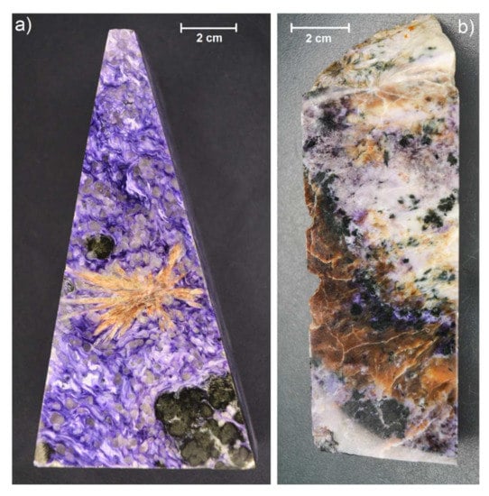 - Kaneva, E.V.; Radomskaya, T.A.; Shendrik, R.Y.; Chubarov, V.M.; Amosova, A.A.; Mitichkin, M.A. FTIR, XRF and powder XRD experimental study of charoite: Crystal chemical features of two associated generations. In Minerals: Structure, Properties, Methods of Investigation. Springer Proceedings in Earth and Environmental Sciences; Votyakov, S., Kiseleva, D., Grokhovsky, V., Shchapova, Y., Eds.; Springer: Cham, Switzerland, 2020; pp. 97–104. [Google Scholar] [CrossRef]