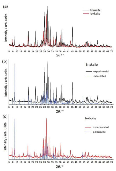 (a) X-ray powder diffraction patterns (XRPDP) of tinaksite and tokkoite; (b) experimental and calculated XRPDP of tinaksite; (c) experimental and calculated XRPDP of tokkoite. The range of 5–70° 2θ is shown.