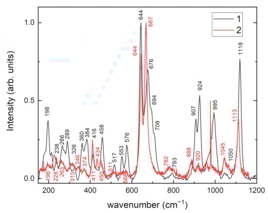 Raman spectra of tinaksite and tokkoite are given in Figure 4. The region with higher wavenumbers after 1200 cm−1 is not given due to a strong luminescence signal. Spectra are both dominated by intense bands, 1118 cm−1 in tinaksite and 1113 cm−1 in tokkoite, assigned to the stretching vibrations of Si–O [32,33]. The most intense bands in tinaksite and tokkoite are located in the region 600–700 cm−1. The bands at 676 and 644 cm−1 in tinaksite and 667 and 644 cm−1 in tokkoite are attributed to Si–O bending or Si–O bridging oxygen mode vibrations [32]. The bands in the region 400–500 cm−1 in the samples correspond to M2(Ca)–O stretching vibrations. The intensities of other bands in the Raman spectrum of tokkoite are much lower than in tinaksite. The bands below 400 cm−1 are due to Si–O–Si bending as well as Ca–O, Na–O, and K–O vibrations.