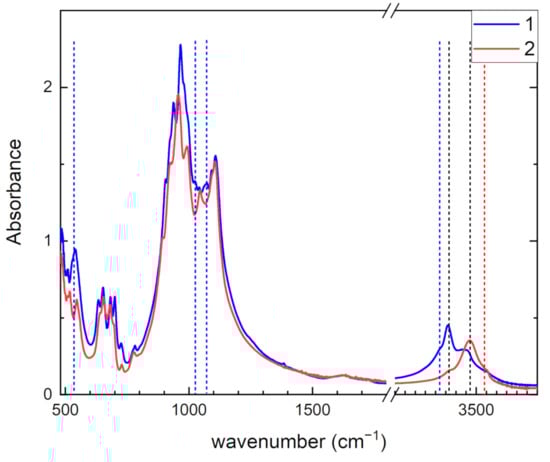 Infrared absorption spectra of tinaksite (1) and tokkoite (2). Vertical lines point positions of Ti-related and OH− stretching bands.