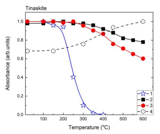 Temperature dependences of relative absorbance of 3320 cm−1 (1); 3366 cm−1 (2); 3470 cm−1 (3) bands and intensity of Fe3+ signal in ESR spectrum (4) of tinaksite.