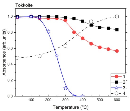 Temperature dependences of relative absorbance of 3360 cm−1 (1); 3470 cm−1 (2); 3540 cm−1 (3) bands and intensity of Fe3+ signal in ESR spectrum (4) of tokkoite.