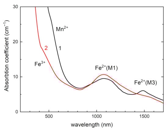 Optical absorption spectra of tinaksite and tokkoite in UV-Vis spectral region are given in Figure 8. The wide band at about 1070 nm is attributed to spin-allowed dd transitions in Fe2+ ions in position M1. The band at about 1500 nm is due to dd transitions in Fe2+ in position M3 (Figure 1a) [40,41]. The shoulder in absorption spectra at about 800 nm in tinaksite and 700 nm in tokkoite corresponds to the presence of Mn2+ and Fe3+ absorption bands [6,10,41]. The coloration of tinaksite and tokkoite is due to the presence of this shoulder. The shade of color depends on the relationship between Fe3+ and Mn2+ concentrations in tinaksite or tokkoite.