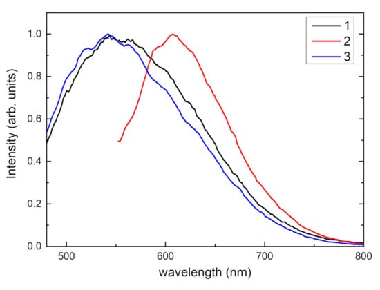 Photoluminescence spectra of tinaksite under 405 nm (curve 1) and 532 nm (curve 2) excitations and tokkoite under 405 nm excitation (curve 3) at 77 K.