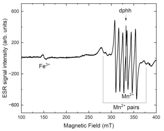 In Figure 10, the ESR spectrum of tokkoite is shown. The Mn2+ center in tokkoite has g = 2.003 and hyperfine constant A = 93 G. The wide ESR signal with g = 2.001 is attributed to Fe3+ ions in the octahedral field. This signal is wide due to exchange interaction in Fe3+ pairs [46]. It is confirmed by crystal chemical data [18], that Fe-ions have two nonequivalent octahedral positions (M1 and M3, Figure 1a).