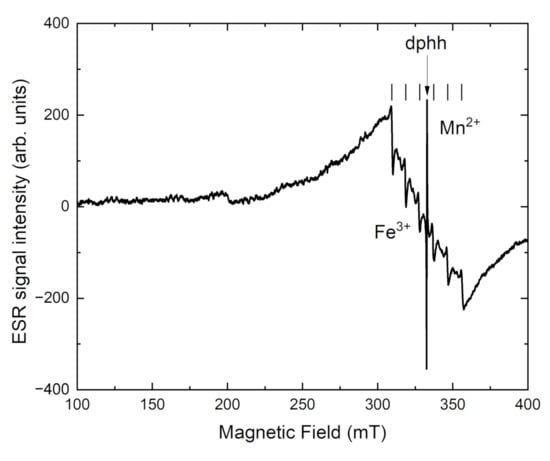 From Figure 10, the ESR parameters for the Mn2+ center in tinaksite are obtained as g = 2.005 and the hyperfine constant A = 90 G. On both sides of the spectrum, a broad ESR signal appears due to Mn2+–Mn2+ coupled pairs. It is confirmed by structural data, that Mn2+ has nonequivalent positions in the tinaksite [6,10,18]. In the tinaksite sample, the signal with g = 4.4 is attributed to Fe3+ ions located in a highly distorted octahedral field in the tinaksite [45].