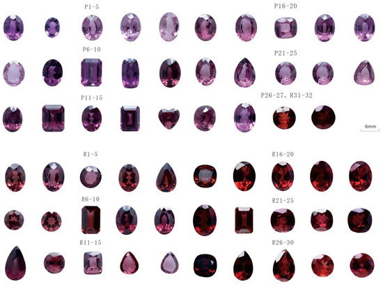 There are 59 samples of pyrope-almandine, which differ in hue, chroma, and lightness (Figure 2). We collected the samples in order to cover all of the colors of pyrope-almandine. The range of weight varies from 0.94 to 2.78 carat, and the shape is between 4 and 8 mm. All samples are cut and polished with various cuts, including emerald, oval, heart, pear, round, and rectangle. All of them are good in transparency, due to the high clarity is a basic guarantee of test accuracy. The standard gemological characteristics of samples are listed in Table 1. The purple ones are numbered as P1–P27, and the red ones are numbered as R1–R32, the hue is determined by the color measurement instrument below.