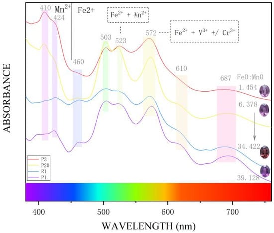 The absorption peaks at 460, 610, and 687 nm disappear in the poor-iron pyrope, and the intensity gradually raises with the rise of ferrum and loss of manganese. The purple sample has strong absorption in the end of the purple region with an absorbed yellow-green region, while there is a transmission area in orange-red zone [19]. Four characteristic samples with the radio of FeO:MnO from low to high are selected to be illustrated in Figure 4.