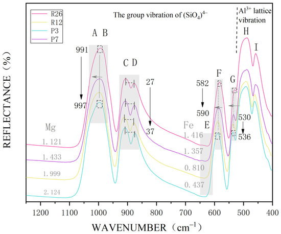 A and B peaks (993–999 cm−1) form the A wide absorption band; the C peak is in 904–914 cm−1, the E peak is missing (635 cm−1) in the pyrope-rich compositions, the F peak is near 586 cm−1, and D (875–881 cm−1) and G (534–536 cm−1) appear in the form of acromion. H and I exist in the vicinity of 490 cm−1 and 460 cm−1, respectively. The deviation of peak position is related to the chemical composition of garnet, so four samples with regular changes in chemical composition are selected for comparison of IR spectra (Figure 5).