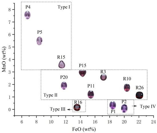 When it comes to the samples with middle content of MnO and FeO, the color depends on the absorption intensity in red and purple zones, combined with the absorption characters of the two typical kinds above. If the red lights are absorbed more, the garnet displays purple color and vice versa. As the trace elements Fe3+ or V3+ and Cr3+ can contribute to the color, it requires further tests to investigate the effect on color [12,23].