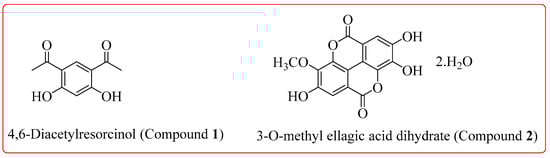 The leaves of Bixa orellana (Family: Bixaceae) were shade-dried and ground into powder (2 kg). A dark green gummy mass was obtained after extracting the air-dried powdered leaves 3 times with 95% ethanol at reflux temperature and evaporating the solvent under reduced pressure. Petroleum ether (60–80), benzene, ethyl acetate, acetone, and methanol were applied to extract the dark green gummy mass. Distillation was used to extract the solvent. Under reduced pressure, the petroleum ether and benzene extracts were concentrated, yielding a greenish sticky substance. The TLC study revealed that petroleum ether and benzene extracts acted the same way in different solvents, thus extracts were mixed. To elute the mixed petroleum ether–benzene extract from a silica gel column, a gradient of increasing solvents was used, including petroleum ether, petroleum ether–benzene, benzene, ethyl acetate, and eventually methanol. Those fractions with similar TLC characteristics and similar IR spectra were grouped. To obtain pure compounds 1 and 2, they were purified using repeated column chromatography followed by fractional crystallization and obtained 4,6-diacetylresorcinol (compound 1) and 3-O-methylalgeic acid dihydrate (Compound 2) was identified by comparison of m.p., TLC, Co-TLC and spectral data (IR, 1H NMR, 13C NMR and Mass) of authentic samples.