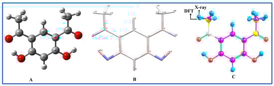 (A) Optimized geometry, (B) XRD of 4,6-diacetylresorcinol (1) and (C) superposition of the optimized structure on the experimental structure atom by atom.